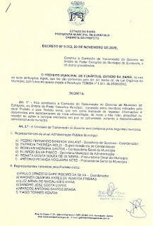 Acatando o pedido da prefeita eleita, o prefeito Robério Oliveira fez publicar na tarde desse mesmo dia o Decreto Municipal 9.363/20 que constitui a Comissão de Transmissão de Governo, no âmbito do Poder Executivo Municipal, composta pelos membros indicados pelo atual prefeito e pela prefeita eleita.