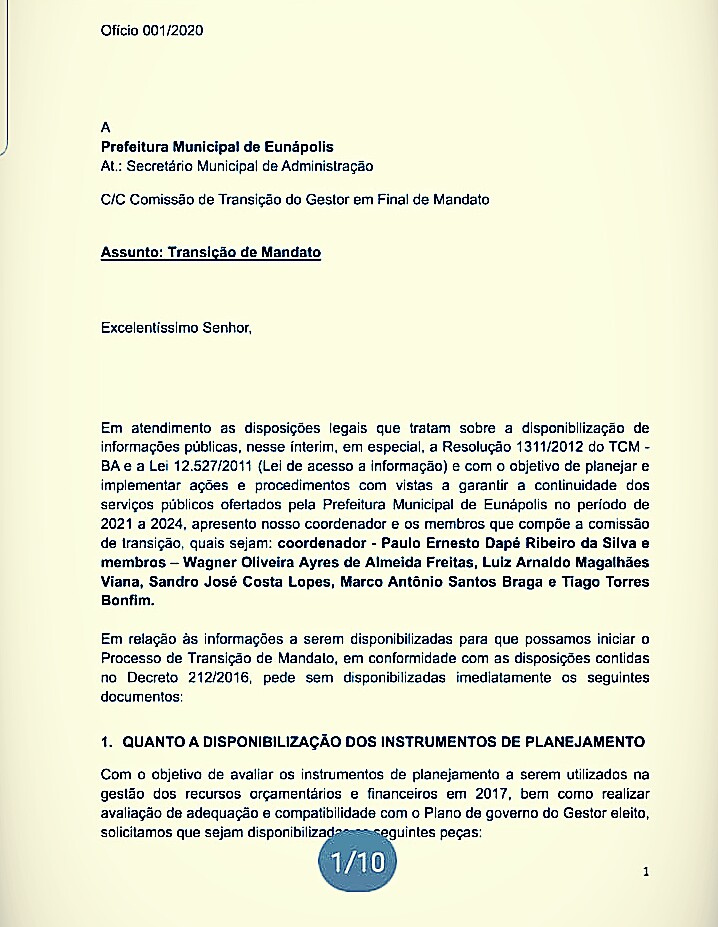 Acatando o pedido da prefeita eleita, o prefeito Robério Oliveira fez publicar na tarde desse mesmo dia o Decreto Municipal 9.363/20 que constitui a Comissão de Transmissão de Governo, no âmbito do Poder Executivo Municipal, composta pelos membros indicados pelo atual prefeito e pela prefeita eleita.