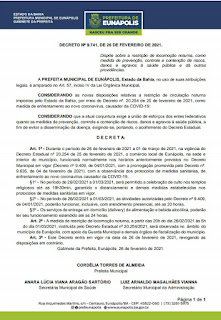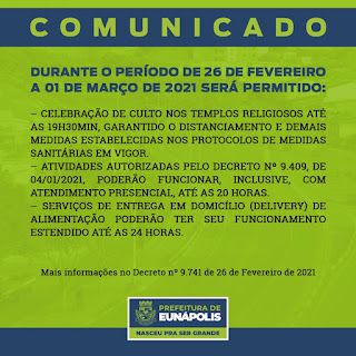 A Prefeitura de Eunápolis decretou novo horário de funcionamento de estabelecimentos e atividades econômicas no município, entre os dias 26 de fevereiro e 1º de março. A decisão, publicada no Diário Oficial de hoje, 27, estabelece que está restrita a locomoção noturna, a permanência e o trânsito em vias, equipamentos, locais e praças públicas, a partir das 20h e até as 05h.