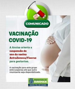 Nesta semana, a Agência Nacional de Vigilância Sanitária (ANVISA) divulgou a recomendação solicitando a paralisação imediata da vacinação contra a covid-19 de mulheres gestantes e puérperas com o imunizante da AstraZeneca/Fiocruz.