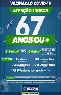 A Prefeitura de Eunápolis, por meio da secretaria municipal de Saúde (SMS), informa que inicia amanhã, sexta-feira, 09 de abril, a vacinação contra a Covid-19 de idosos acima de 67 anos. A campanha continua e tem contado com a adesão da população.