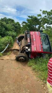 Imagens mostram o veículo tombado próximo à ponte, cujo estado precário de manutenção tem sido motivo de alerta.