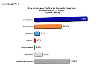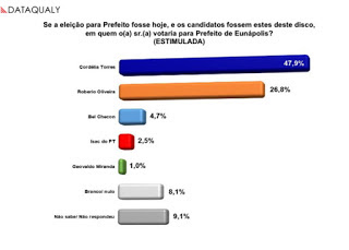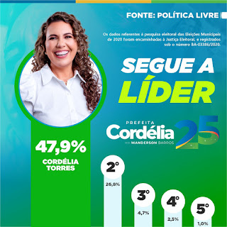 A pesquisa aponta a liderança da candidata Cordélia Torres, que aparece com 47,9 pontos percentuais enquanto o segundo colocado pontua com 26,8%.
