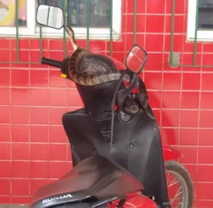 Os policiais encontraram o animal em cima de uma motocicleta que estava estacionada nas dependências do imóvel. A polícia não deu detalhes se havia crianças no local quando o animal foi localizado. Os agentes recolheram a cobra e levaram o réptil a uma região de matagal, onde foi devolvido à natureza sem oferecer riscos à população.