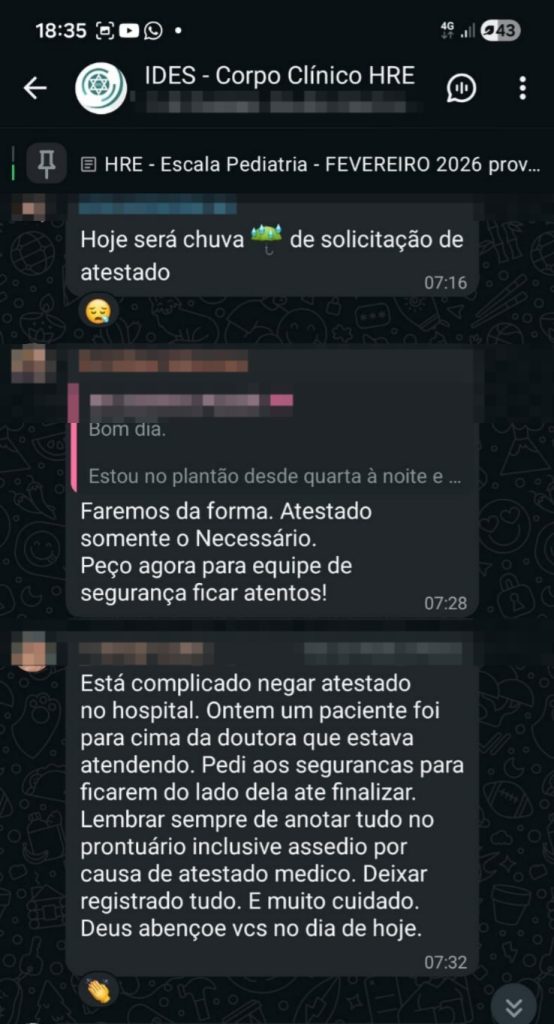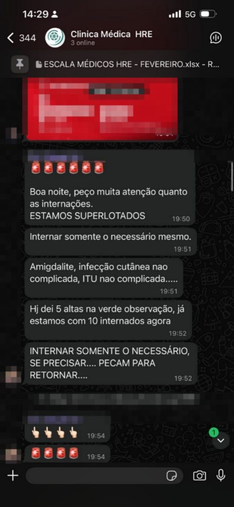Em fevereiro, com o hospital lotado e a emergência explodindo de gente, a postura de esvaziar seguiu como estratégia da gestão. Notem que, no início do mês (mais precisamente no dia 4 de fevereiro de 2026), os médicos foram alertados quanto à superlotação, com a diretriz expressa de “…internar somente o necessário mesmo…“. Neste mesmo período, um homem que procurou atendimento devido a uma infecção cutânea ficou sentado em uma cadeira aguardando seguimento, até que sua família implorasse por ajuda a um funcionário. Infelizmente, ele faleceu dias depois.