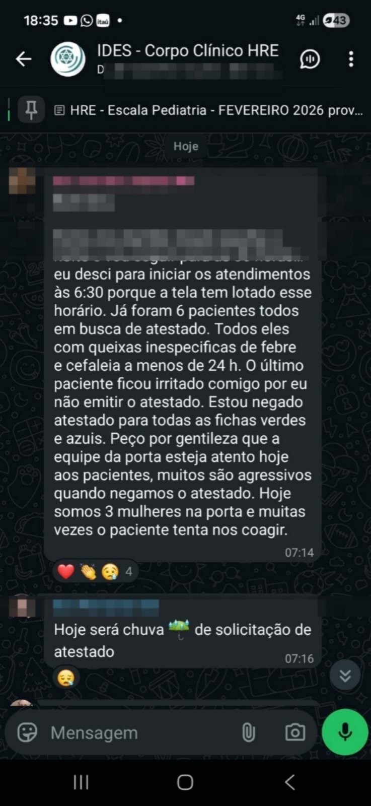 Em fevereiro, com o hospital lotado e a emergência explodindo de gente, a postura de esvaziar seguiu como estratégia da gestão. Notem que, no início do mês (mais precisamente no dia 4 de fevereiro de 2026), os médicos foram alertados quanto à superlotação, com a diretriz expressa de “…internar somente o necessário mesmo…“. Neste mesmo período, um homem que procurou atendimento devido a uma infecção cutânea ficou sentado em uma cadeira aguardando seguimento, até que sua família implorasse por ajuda a um funcionário. Infelizmente, ele faleceu dias depois.