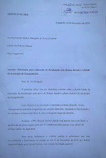 O Presidente do PSL/ Eunápolis e candidato a vereador, Bruno do Trigo, preocupado com as irregularidades e abusos cometidos em outros processos eleitorais, protocolou nesta terça feira, 03/11,ofício solicitando da Polícia Federal que seja disponibilizado um drone para acompanhamento e flagrante de possíveis ações abusivas ou tentativas de fraude nas eleições 2020 em Eunápolis, no Extremo Sul da Bahia.