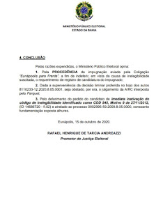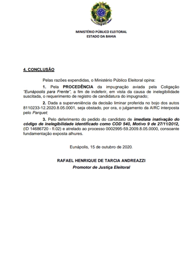 O parecer encaminhado ao Juiz Eleitoral de Eunápolis, Benedito Alves Coelho, pelo Promotor de Justiça Eleitoral, Rafael Henrique Andreazzi, fundamentado no fato de que Robério Oliveira se encontra inelegível por condenações em segunda instância, improbidade administrativa e enriquecimento ilícito.