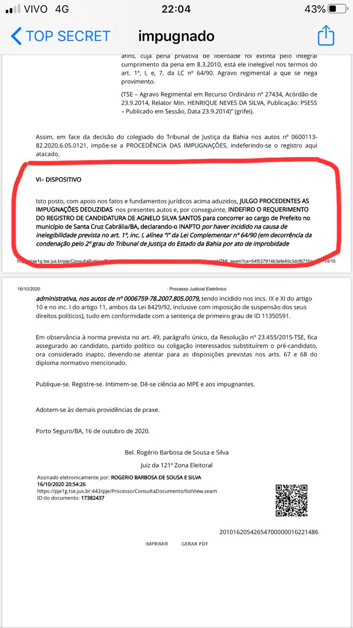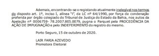A mesma interpretação foi dada pela promotora Lair Faria Azevedo, sobre o pedido de impugnação do registro de candidatura do atual prefeito e suposto candidato à reeleição em Cabrália, Agnelo Santos, formulado pelo Partido Verde (PV). Os dois foram condenados em segunda instância, em processo que envolve o abastecimento do trio-elétrico “Axé e Cia”, de propriedade da família Oliveira, com dinheiro público. À época, Agnelo era o Secretário de Finanças em Eunápolis.