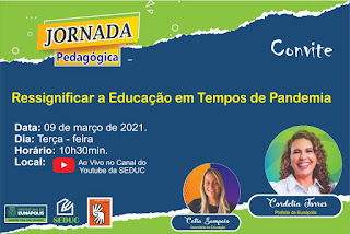 “Ressignificar a Educação em Tempos de Pandemia” é o tema da jornada pedagógica que acontece nesta terça-feira, 09, a partir das 10h30min, em Eunápolis. Organizada pela Prefeitura, por meio da secretaria de Educação (Seduc), a Jornada 2021 contará com painéis da prefeita Cordélia Torres, Edna Rodrigues, gerente municipal de currículo da Prefeitura de Salvador e da psicopedagoga da rede municipal de ensino, em Eunápolis, Michelle Passos.