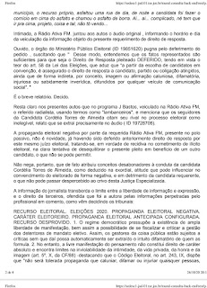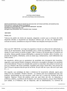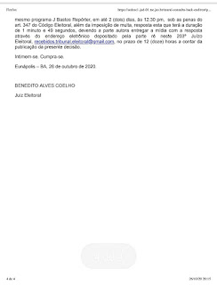 Nesta segunda-feira, 26,  o Juiz Benedito Silva Coelho,  titular da 230a. Zona Eleitoral de Eunápolis, publicou sentença em desfavor da Rádio Ativa FM, em face do pedido de direito de resposta da candidata Cordélia Torres (DEM), a ser veiculado no mesmo programa  J.Bastos Repórter, em até 2 (dois) dias, sob as penas do artigo 347 do Código Eleitoral, além da imposição de multa, com duração de 1 minuto e 49 segundos.
