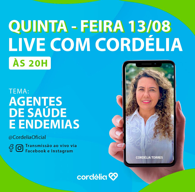 Nesta quinta-feira, 13 de agosto, a pré-candidata a prefeita de Eunapolis, Cordélia Torres, faz uma live. A partir das 20h, no Instagram e no Facebook, Cordélia vai discutir sobre a importância e segurança dos agentes de saúde e endemias nesse momento. Apesar do grave problema de saúde que estamos vivendo, os agentes têm se arriscado para atender a necessidade da população e para cumprir suas tarefas.