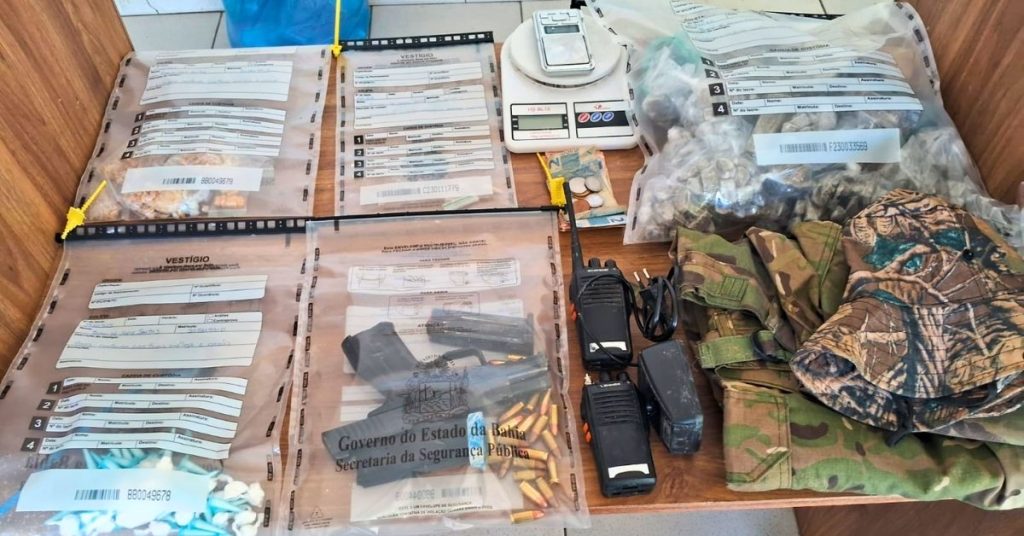 A operação resultou em uma apreensão significativa de material ilícito. No esconderijo utilizado pelo grupo, os agentes encontraram uma pistola calibre 9mm equipada com carregadores e munições, além de um vasto estoque de drogas, composto por dois tabletes e mais de 300 porções de maconha, centenas de pedras de crack e pinos de cocaína. Também foram confiscados rádios comunicadores, balanças de precisão, vestuário tático e quantias em dinheiro vivo.