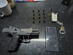 Durante a abordagem, os policiais encontraram uma pistola calibre .40 com 12 munições intactas no veículo Hyundai Elantra preto que Saulo estava conduzindo.