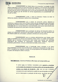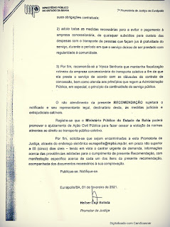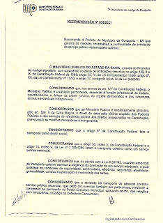 O Ministério Público do Estado da Bahia, por meio da 7ª Promotoria de Justiça de Eunápolis, recomendou à Prefeitura, anteontem, dia 1º, a garantia imediata da continuidade do serviço do transporte público coletivo, em Eunápolis.