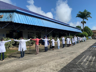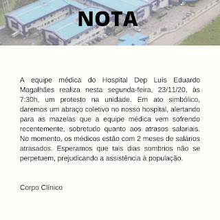 Equipe médica do Hospital HRDLEM protesta nesta segunda-feira, 23/11, contra atraso de salários, com abraço coletivo na unidade para chamar a atenção de autoridades, comunidade e imprensa.