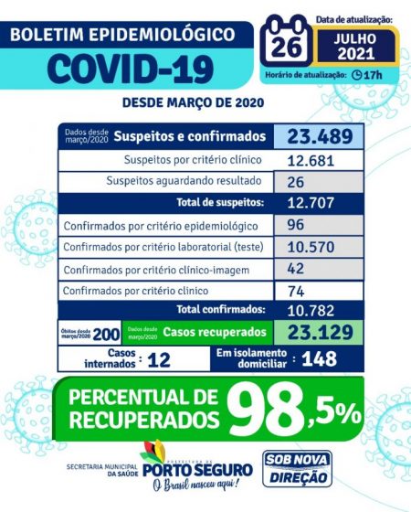 Porto Seguro hoje tem 23.129 pessoas recuperadas, totalizando um percentual de 98,5% entre os suspeitos…