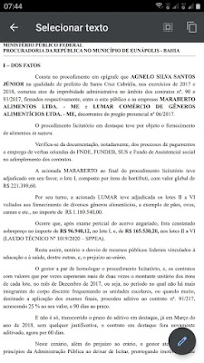 Segundo o MPF, Agnelo Santos Junior (PSD), fraudou licitações e aplicou sobrepreço causando prejuízo ao erário em favor das empresas Lumar Comércio de Gêneros Alimentícios Ltda – ME e Maraberto Alimentos Ltda – ME, com notado crime contra a União, ao FNDE, SUS, FUNDEB e Fundo de Assistencial social, incorrendo em improbidade administrativa, por lesar os cofres públicos.