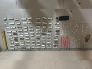 Durante a abordagem, os policiais encontraram uma embalagem plástica contendo drogas. Ao realizar uma busca mais detalhada no imóvel, os agentes localizaram uma sacola plástica com mais entorpecentes, totalizando 89 tabletes de maconha (2.435 kg), 48 pinos de cocaína (80g), 112 pedras de crack (20g) e 20 buchas de maconha (20g) . Além das drogas, também foram descobertos um relógio, um aparelho celular e um rolo de plástico.