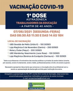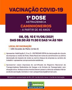 ENÁPOLIS: VACINA COVID-19 – 1ª DOSE PARA CAMINHONEIRO A PARTIR DE 40 ANOS (8,9,10 e 11/06)