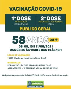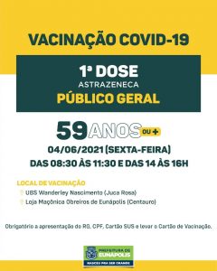 VACINEUNÁPOLIS – 1º DOSE PARA PESSOAS A PARTIR DE 59 ANOS: Público Geral – Sexta-feira (04/06)