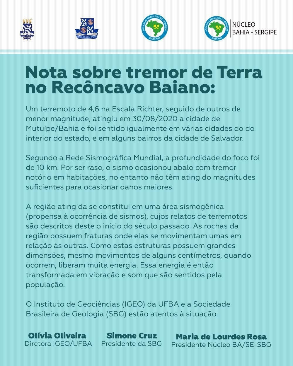 Em nota conjunta, o Instituto de Geociências (Igeo) da Ufba e a Sociedade Brasileira de Geologia (SBG) confirmaram e comentaram os registros e disseram estar atentos à situação.