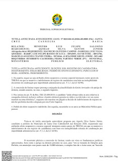 Faltando dez dias para as eleições municipais e já tendo perdido o prazo para apresentar outro nome como candidato da majoritária, na iminência de ver cair toda a chapa, o prefeito de Cabrália se desespera e apela, forjando uma grosseira mentira lançando mão de um trecho citado na decisão cautelar – que a bem da verdade NÃO foi favorável ao candidato a concorrer às eleições municipais – para fingir que se encontra apto e com a candidatura liberada pelo TSE.